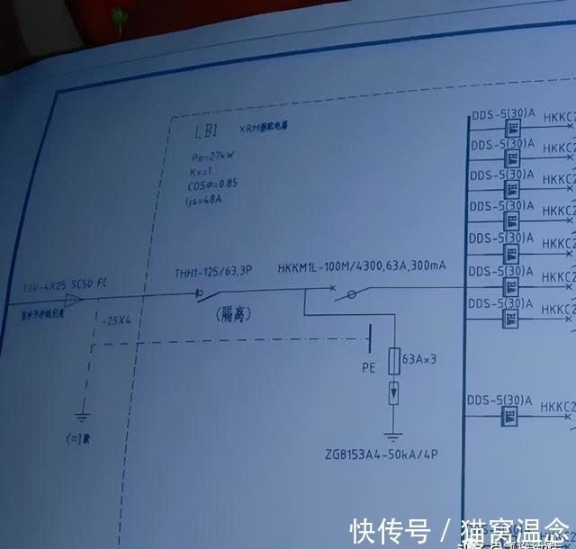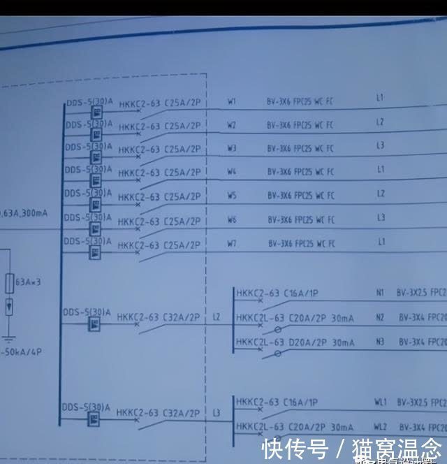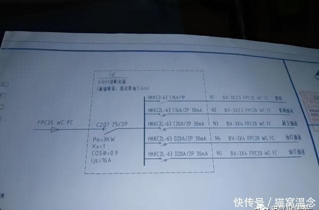 HE 盒有五个电路 N1~N5。照明电路HKKC2-63 C16A/1P表示塑壳微型断路器,1P表示1极,只接一根火线。 C16A为普通家用断路器,额定电流16A,无漏电WC CC为3根2.5平方线,穿20根阻燃管,沿墙壁和顶面暗敷。如上图所示。